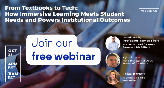 Join our free webinar delivered in partnership with Immersify EducationFrom Textbooks to Tech, How Immersive Learning Meets Student Needs and Powers Institutional Outcomes, will be delivered on 23rd October at 16:00 UK. To find out more on what to expect or to register for this free session click here.