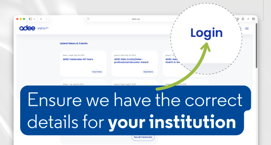 Time to check your user profileThis is the time of year we prepare institution invoices for 2026. We ask all key contacts to please ensure we have the correct details for your institution. To update these please email administrator@adee.org. |