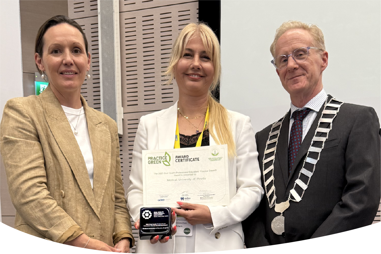 ![]() receiving a 2025 social excellence award on behalf of their school: Medical University of Plovdiv - Plovdiv, Bulgaria, whose “Future Dentists in Action” programme - a dental student organisation committed to providing preventive oral health care in rural areas operates under the slogan “Dedicated to Humanity!” in recognition of their efforts to deliver treatment and education to underserved communities through charitable events.